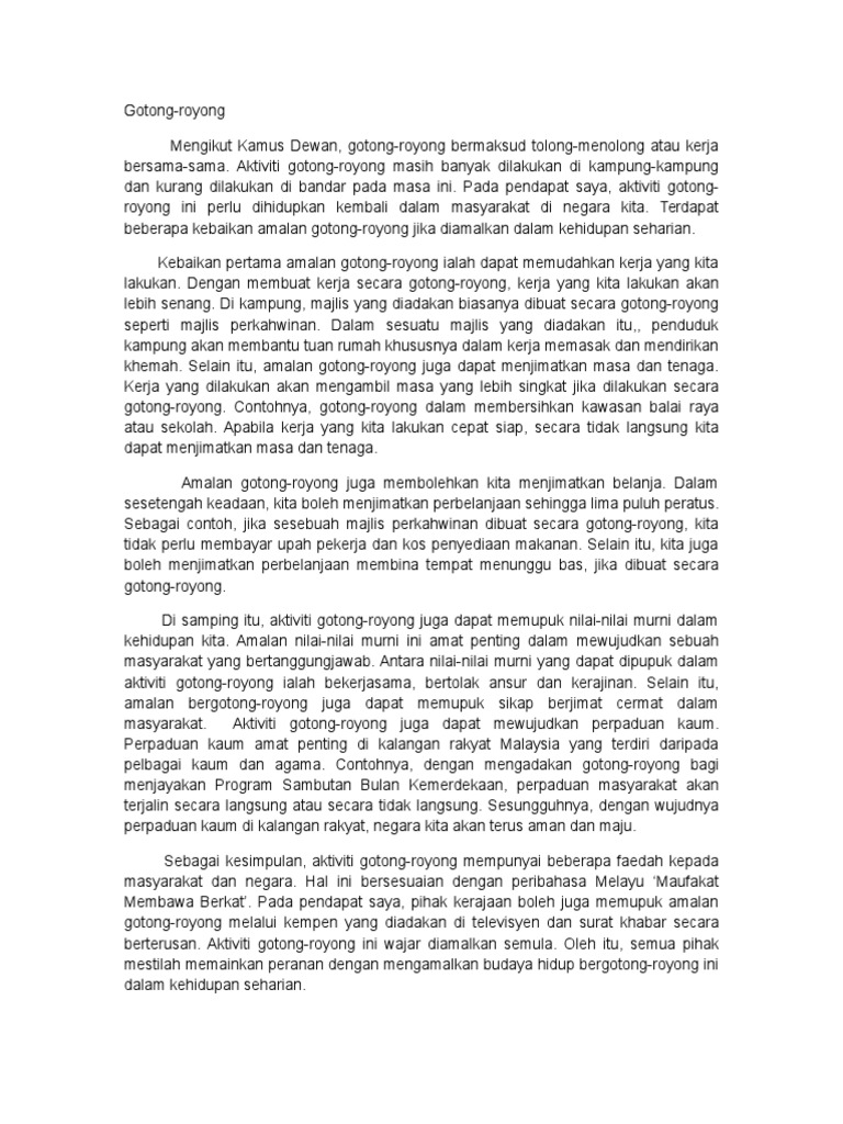 More images for contoh karangan kebaikan amalan gotong royong Namun dalam meniti arus kemodenan hari ini amalan gotong royong semakin dilupakan oleh masyarakat konvensional di mana pelbagai manfaat yang mampu diperoleh menjadi kerugian. Oct 11 2009 amalan ini tidak akan dilupai. 1 Faedah Amalan Gotong Royong dalam kalangan Masyarakat 11 Mengeratkan perpaduan 12 Mempermudah kerja seharian 13 Memperkukuh semangat kejiranan 14.
